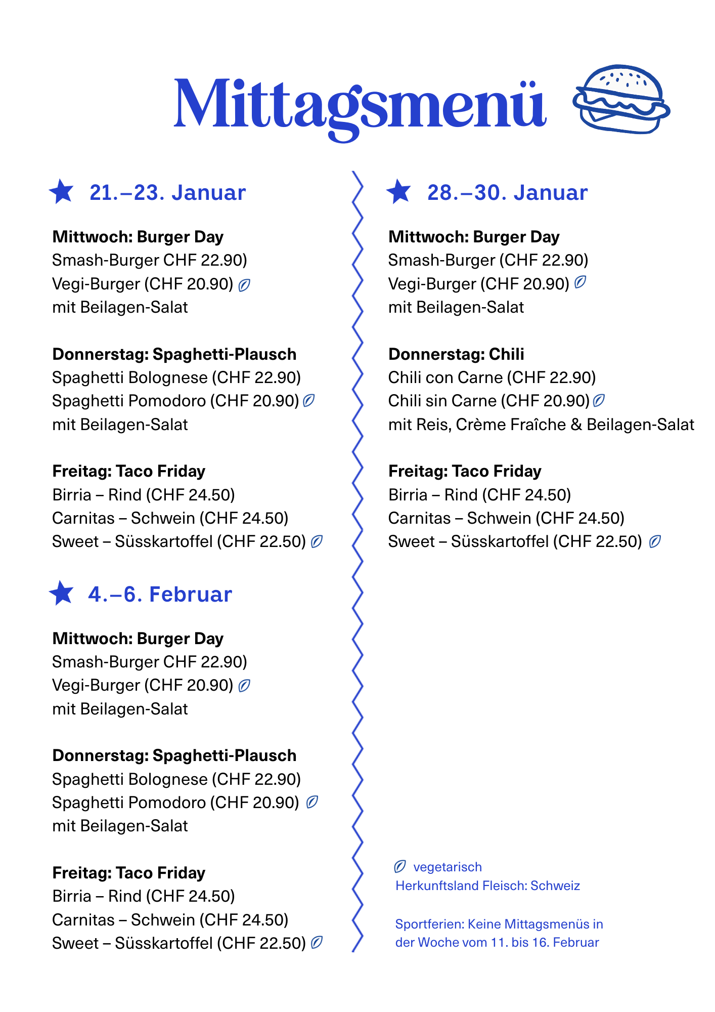 Frisch, lecker & mit Liebe gemacht: Ab 21. Januar haben wir jeweils von Mittwoch bis Freitag auch Mittagsmenüs im Angebot. Von Burgern über Pasta bis zu Tacos ist für jeden Geschmack etwas dabei.